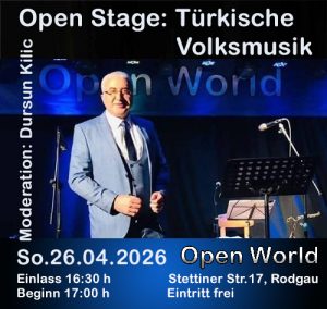 Die Kulturinitiative Open World Rodgau e.V. setzt ihr Engagement für die Integration und den kulturellen Austausch in unserer multikulturellen Gesellschaft fort.Im Rahmen unserer kulturellen Arbeit präsentieren wir eine neue Konzertreihe unter dem Namen „Open Stage“.Ziel ist es, bei jeder Veranstaltung Musik eines anderen Kulturkreises zu präsentieren. Wie beim Open Stage Veranstaltungen üblich, kann jeder Musiker mit Gesang oder Musikinstrument mitspielen.